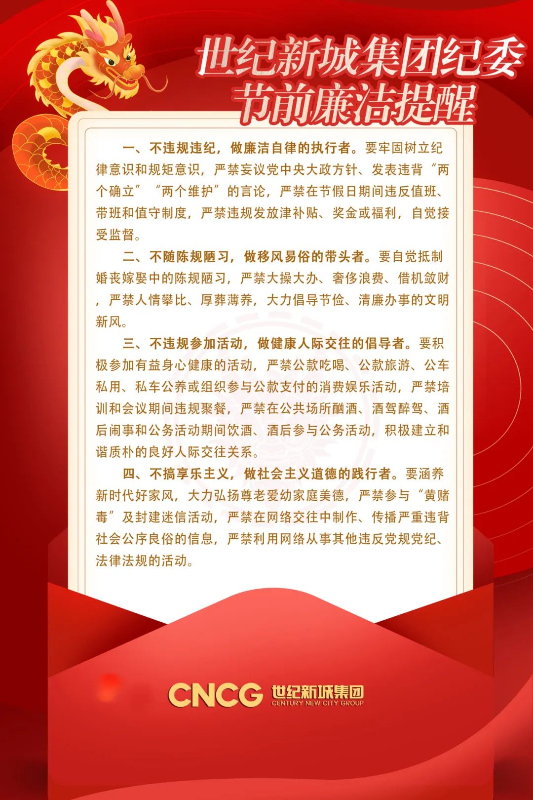 春節(jié)將至,世紀(jì)新城集團(tuán)紀(jì)委向您和您的家人致以誠摯的問候和美好的祝福。為深化落實(shí)中央八項(xiàng)規(guī)定精神,營造風(fēng)清氣正、文明祥和的節(jié)日氛圍,這份廉潔提醒請您收好: