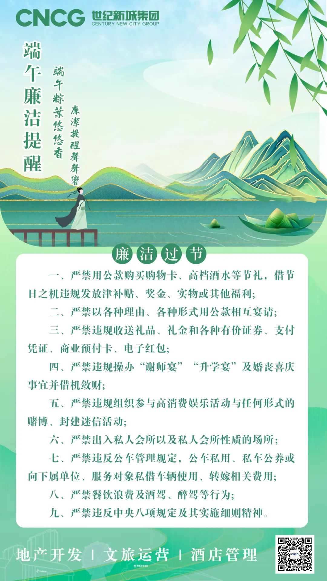 端午粽葉悠悠香,廉潔提醒聲聲響。假日風光無限好,各項禁忌要記牢。端午將至,為進一步貫徹落實中央八項規(guī)定精神,持續(xù)糾治“四風”,凈化節(jié)日風氣,江蘇世紀新城集團紀委提醒您: