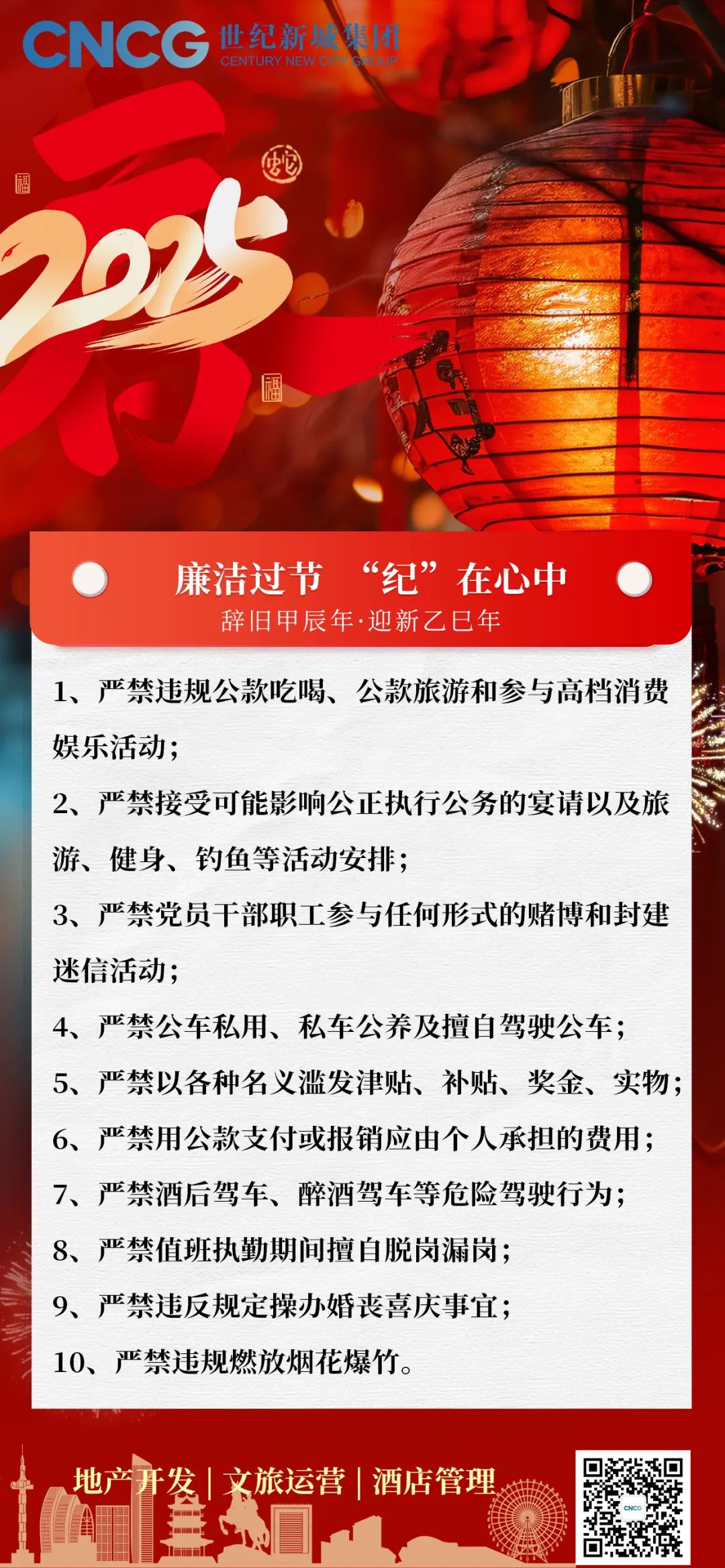 律回春暉漸,萬象始更新。為深入貫徹黨的二十大和二十屆二中、三中全會(huì)精神,從嚴(yán)落實(shí)中央八項(xiàng)規(guī)定精神,持續(xù)強(qiáng)化春節(jié)期間作風(fēng)紀(jì)律,營(yíng)造廉潔、文明、節(jié)儉的節(jié)日新風(fēng),世紀(jì)新城集團(tuán)紀(jì)委在此發(fā)出廉潔過節(jié)溫馨提示,希望集團(tuán)全體黨員干部職工嚴(yán)格落實(shí)中央八項(xiàng)規(guī)定精神及其實(shí)施細(xì)則,遵守廉潔自律準(zhǔn)則,嚴(yán)格做到以下“十個(gè)嚴(yán)禁”,過一個(gè)廉潔文明、歡樂祥和、風(fēng)清氣正的節(jié)日。