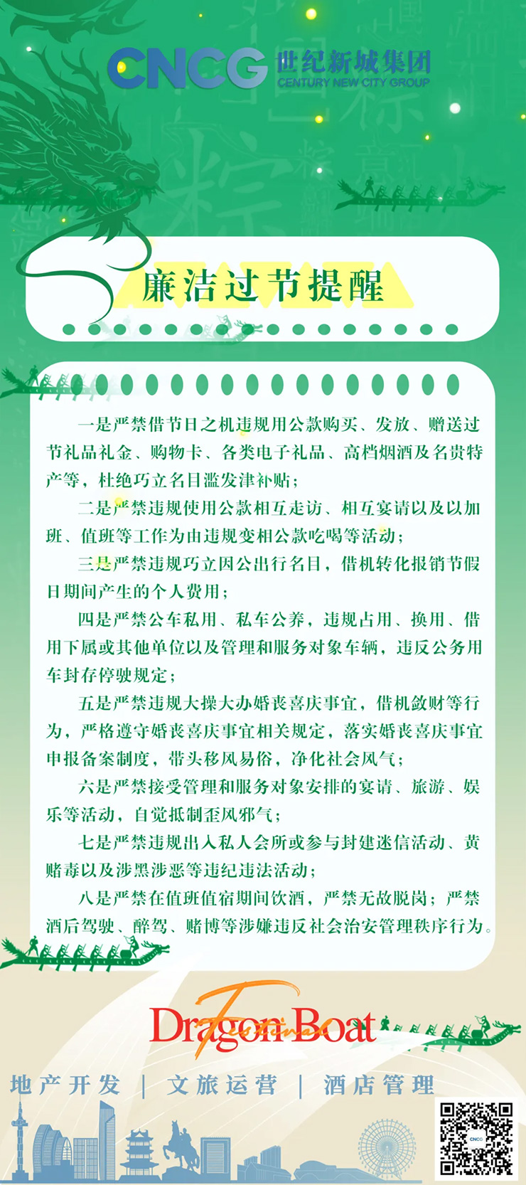 端午臨中夏,時(shí)清日復(fù)長(zhǎng)。一年一度端陽(yáng)日,廉潔自律記心間,世紀(jì)新城集團(tuán)紀(jì)委提醒廣大干部職工,節(jié)日期間不忘堅(jiān)守紀(jì)律“底線(xiàn)”,不碰紀(jì)律“紅線(xiàn)”,做到風(fēng)清氣正迎仲夏,“粽”享廉潔端午節(jié)。