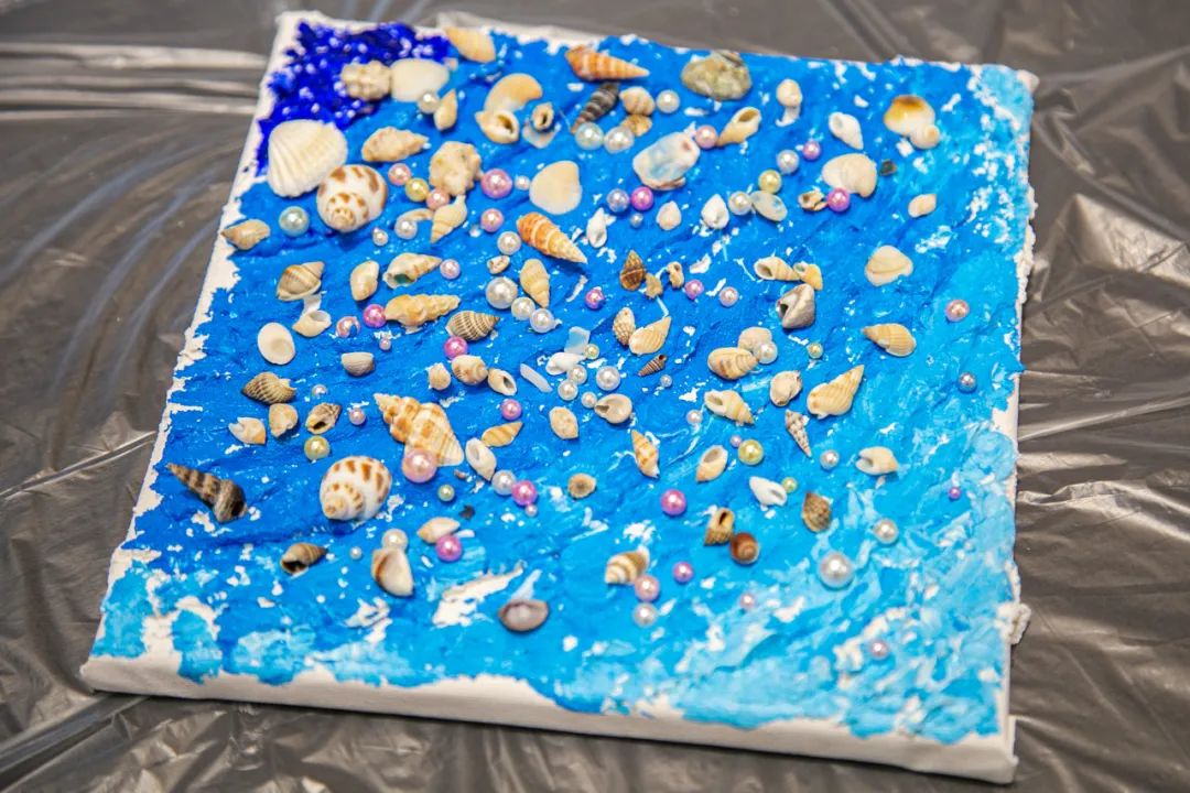大家構思分布海浪的結構和位置,小心翼翼的用鉛筆在畫板上畫出大致輪廓,再將石英砂混入丙烯顏料增加肌理感。小巧的刮刀變成了靈活的畫筆,大家用不同手法“刮”出各種縱橫交錯、凹凸不平的紋理,最后再搭配上貝殼以及珍珠裝飾,一幅幅精美獨特的作品由此誕生。