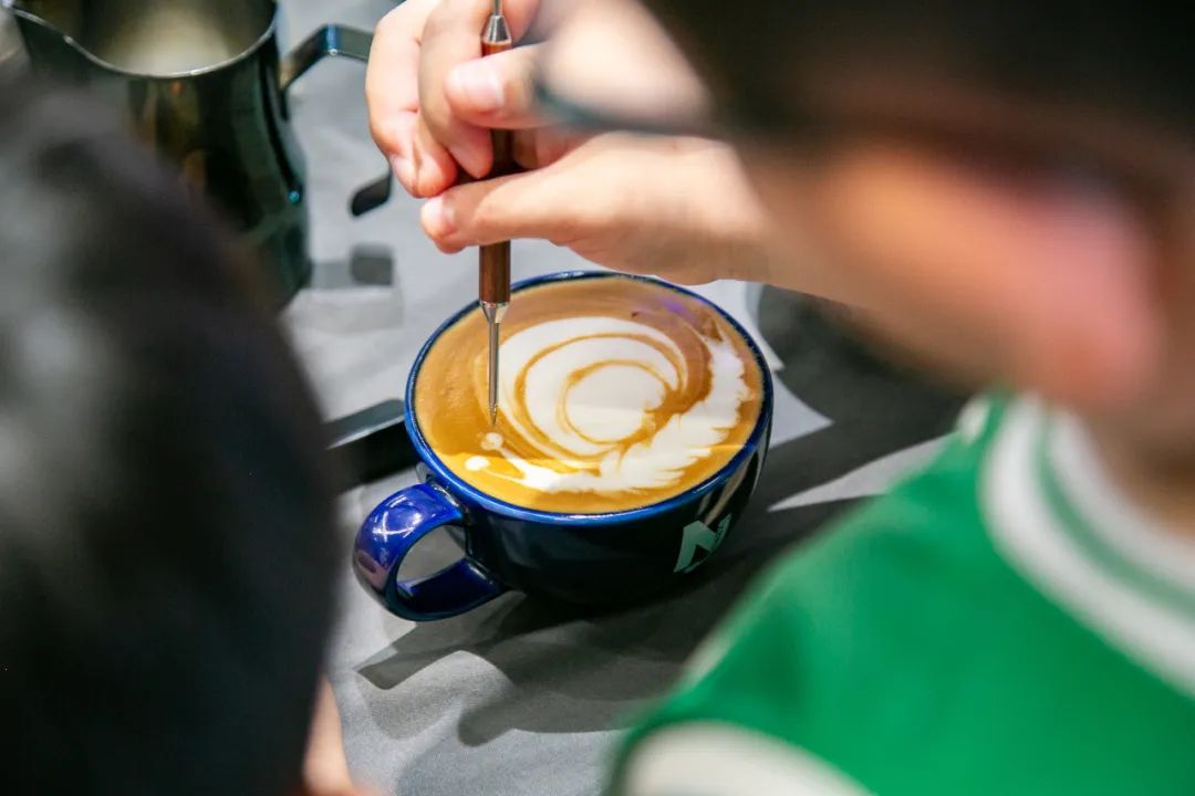 現(xiàn)場氣氛高漲,在咖啡師的指導(dǎo)和幫助下,大家傾斜著咖啡杯輕輕晃動著拉花缸,發(fā)揮自己的藝術(shù)創(chuàng)想,制作出一個個靈動可愛的圖案,度過了一段悠閑的夏日時光。