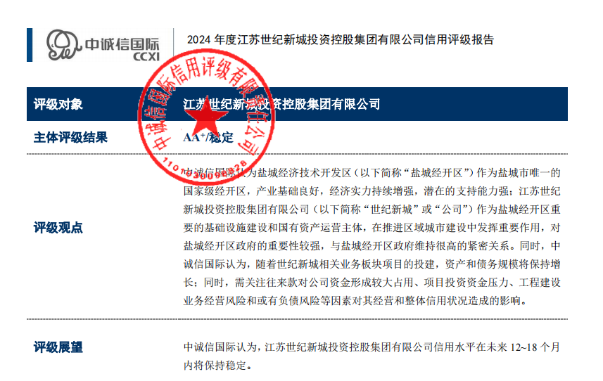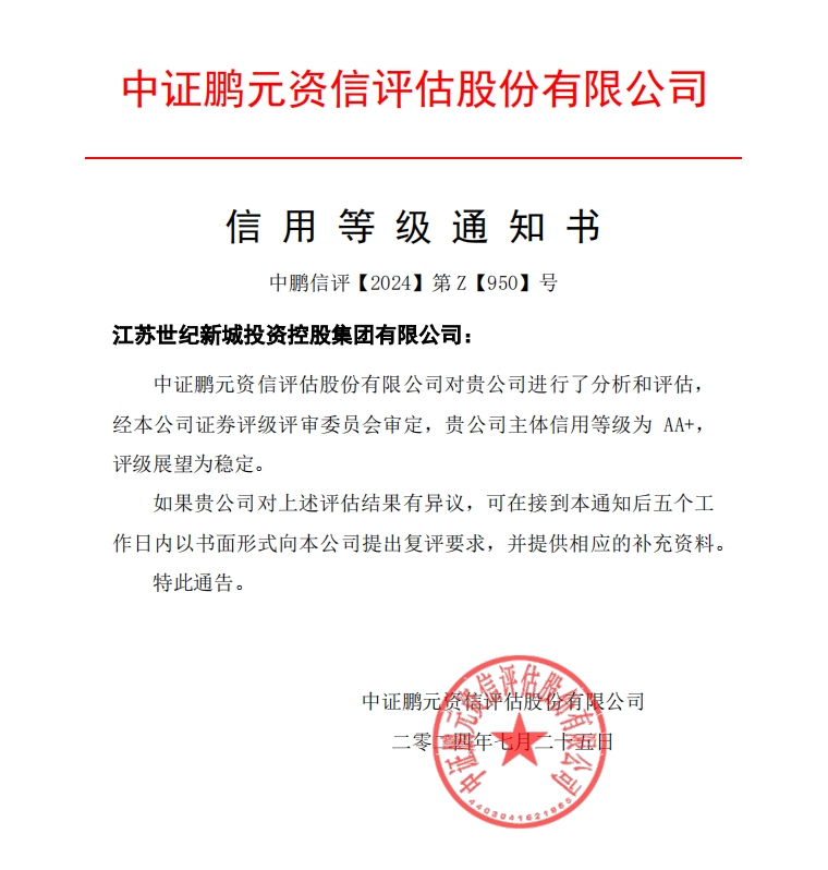 7月30日,中誠信國際信用評級有限責(zé)任公司、中證鵬元資信評估股份有限公司等信用評級機構(gòu)決定將江蘇世紀(jì)新城投資控股集團有限公司主體信用等級評定為AA+,標(biāo)志著集團實現(xiàn)了AA+評級的歷史性突破!