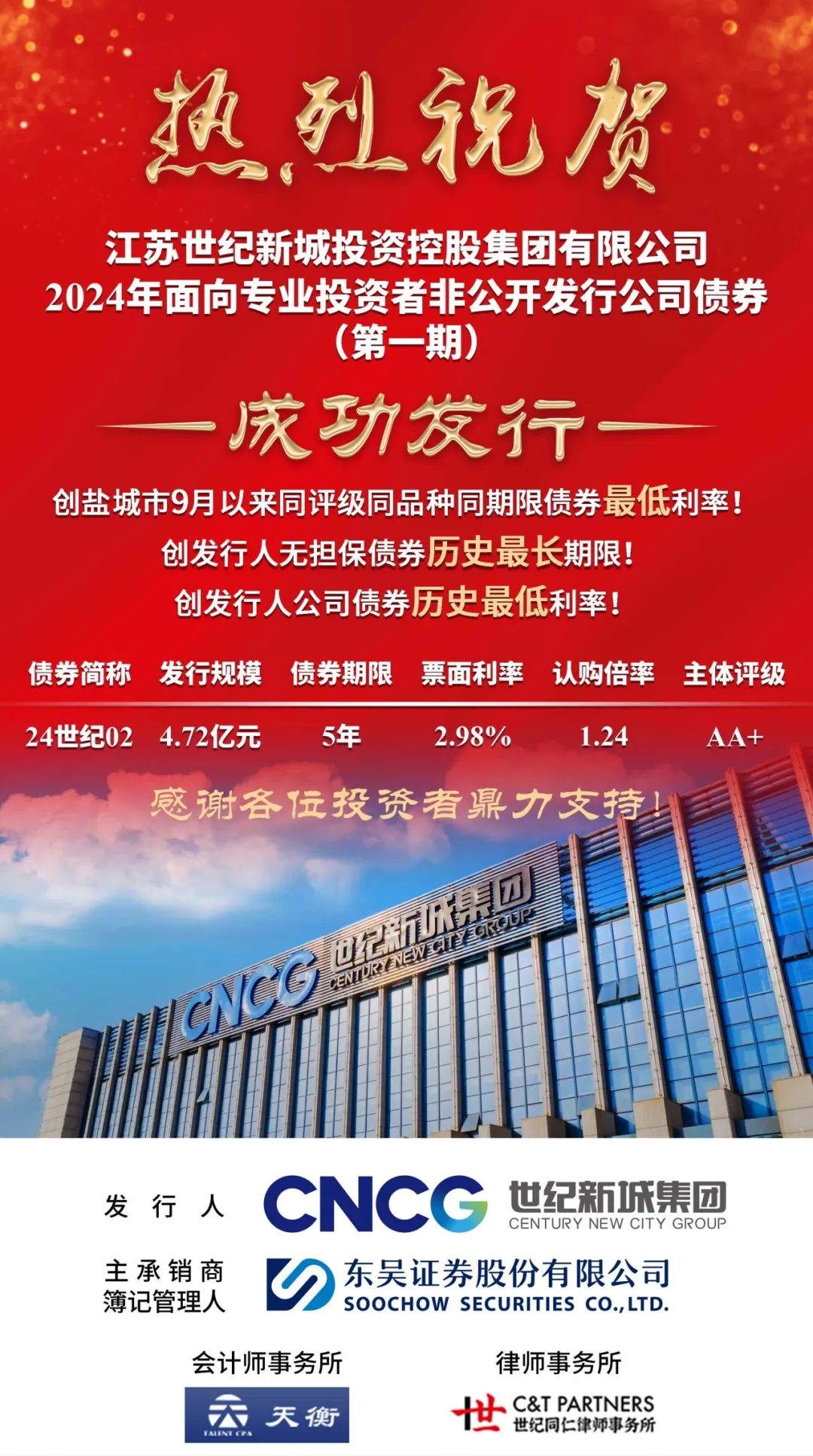 2024年10月25日,江蘇世紀(jì)新城投資控股集團(tuán)有限公司2024年面向?qū)I(yè)投資者非公開發(fā)行公司債券(第一期)在上海證券交易所成功發(fā)行。本期債券由東吳證券股份有限公司擔(dān)任主承銷商及簿記管理人,根據(jù)主流發(fā)行方式和市場(chǎng)行情,最終本期債券發(fā)行規(guī)模為4.72億元,發(fā)行期5年,發(fā)行利率為2.98%。本期債券是我司自獲AA+評(píng)級(jí)以來首次發(fā)行,創(chuàng)我司公司債券歷史最低利率!創(chuàng)我司無擔(dān)保債券歷史最長(zhǎng)期限!創(chuàng)鹽城市9月以來同評(píng)級(jí)同品種同期限債券最低利率!該筆公司債券的發(fā)行對(duì)優(yōu)化我司債務(wù)融資結(jié)構(gòu)具有積極意義。