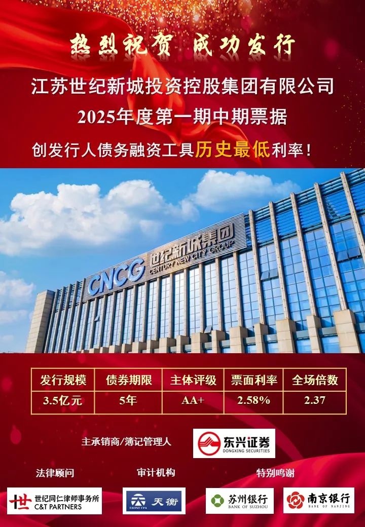 2025年1月15日,江蘇世紀新城投資控股集團有限公司2025年度第一期中期票據(jù)在中國銀行間市場成功發(fā)行。本期債務融資工具由東興證券股份有限公司擔任主承銷商及簿記管理人,根據(jù)主流發(fā)行方式和市場行情,最終本期債務融資工具發(fā)行規(guī)模為3.5億元,發(fā)行期限為5年,發(fā)行利率為2.58%。本期中期票據(jù)創(chuàng)我司債務融資工具歷史最低利率,創(chuàng)我司債務融資工具歷史最長期限,該筆公司債券的發(fā)行對優(yōu)化我司債務融資結構具有積極意義!