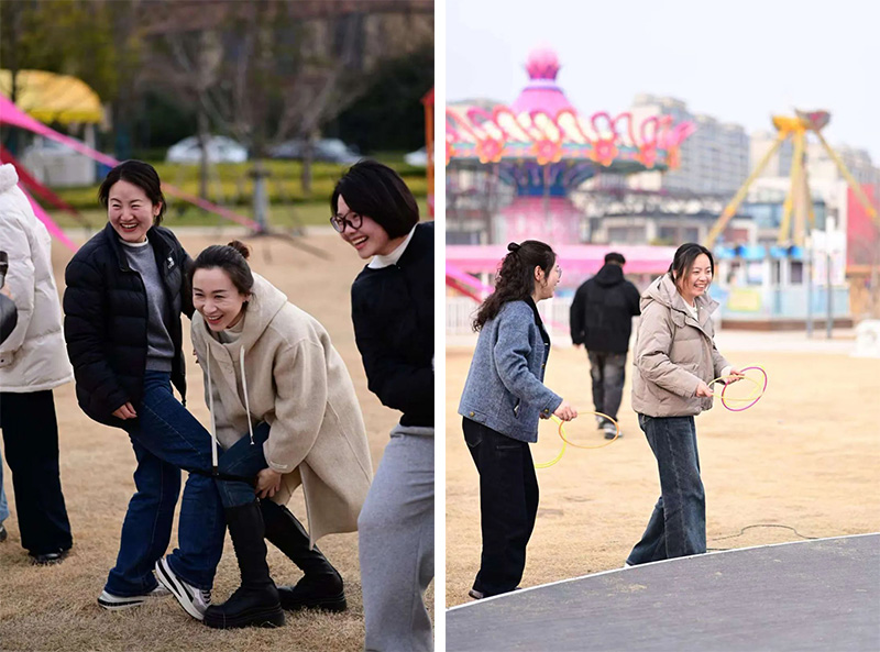 演藝公司精心準(zhǔn)備的一曲長歌拉開活動帷幕,氛圍感迅速拉滿,緊接而來的互動娛樂游戲,更是不斷將現(xiàn)場氣氛推向高潮。套圈圈環(huán)節(jié),投手們屏息凝神,反復(fù)觀瞄,套中獎品的歡呼聲響徹全場;兩人三足比賽中,大家兩兩一組,配合默契,在加油聲中你追我趕。