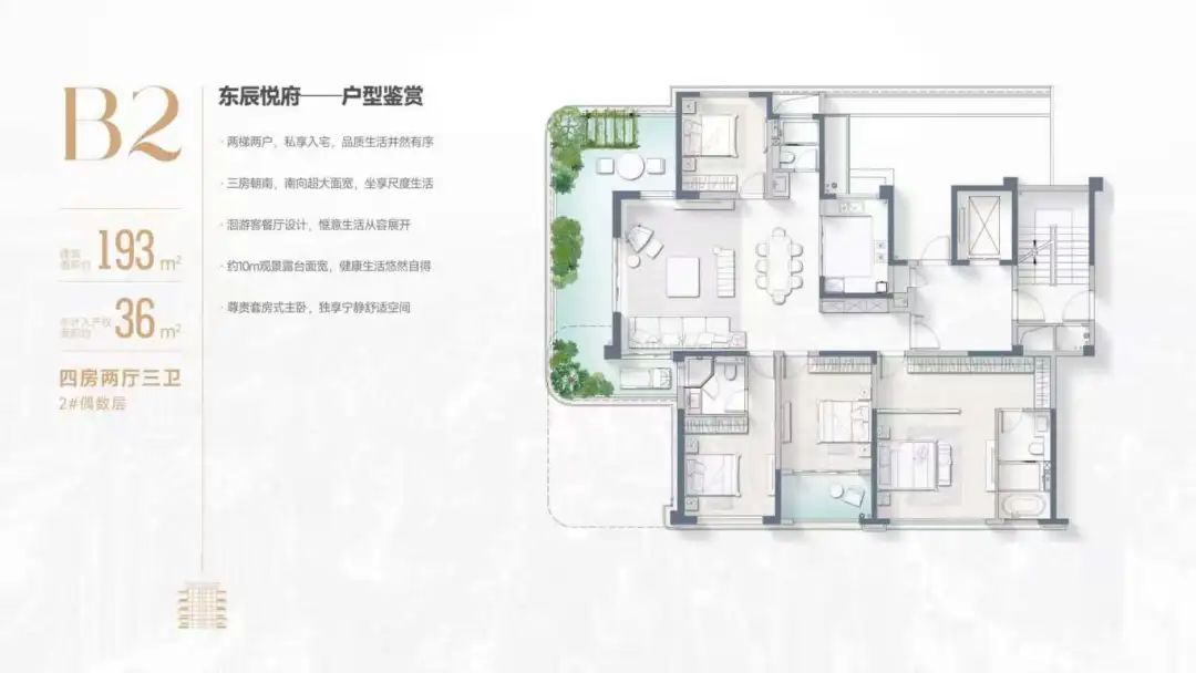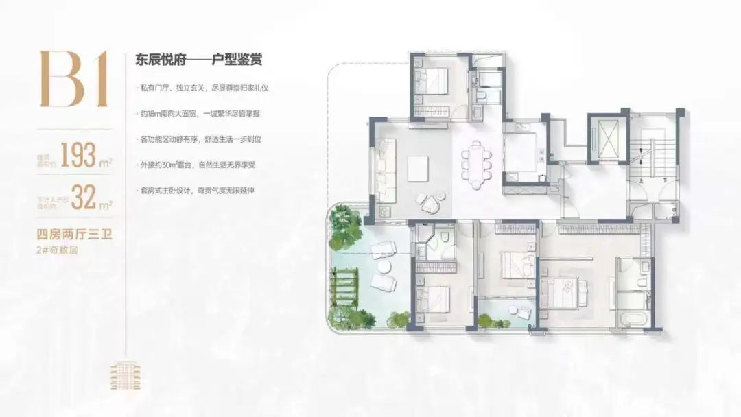 東辰悅府采用奇偶錯(cuò)層設(shè)計(jì),以約193㎡B1戶型為例,4室2廳3衛(wèi)的全維度生活場(chǎng)景,約3.15米的挑高,約18米南向全景采光面,南北通透。獨(dú)立電梯入戶,生活優(yōu)雅從容。外拓約30㎡露臺(tái),既有“院落”的閑適,也有“大平層”的采光通透性,創(chuàng)造出更加豐富的生活方式。未來(lái),這里是運(yùn)動(dòng)健身、親子互動(dòng)的家庭樂(lè)園,也可以是商務(wù)會(huì)談、茶歇聚會(huì)的待客空間,也可以是侍花弄草、品茗賞景的自在天地,讓住宅為日常生活提供“回歸自然”的情緒價(jià)值。